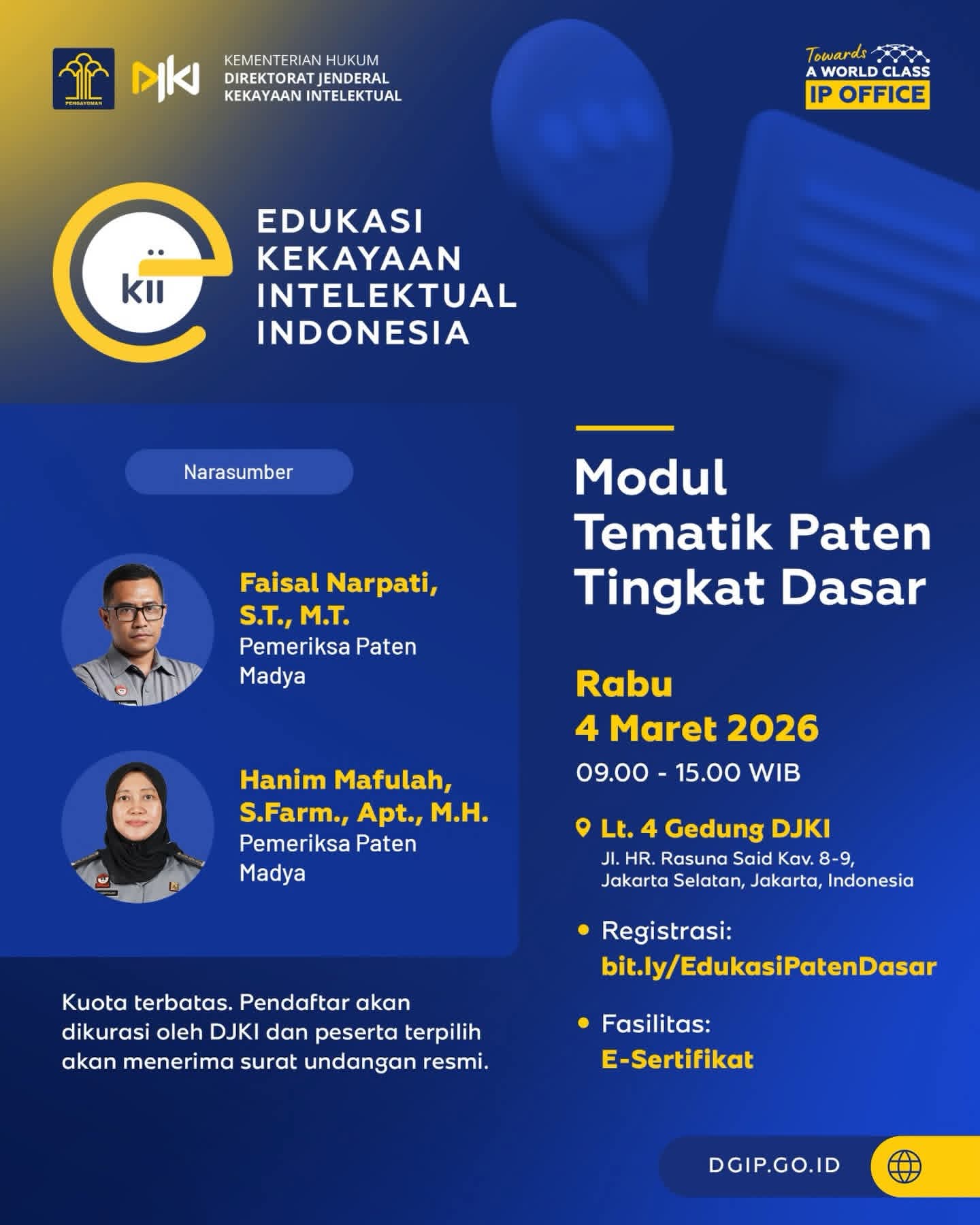 *kuota peserta terbatas, seluruh pendaftar akan dikurasi oleh DJKI. Peserta terpilih akan menerima konfirmasi resmi berupa surat undangan untuk dapat menghadiri kegiatan.